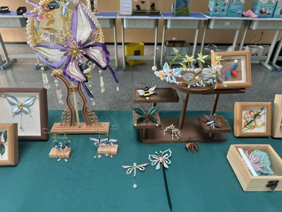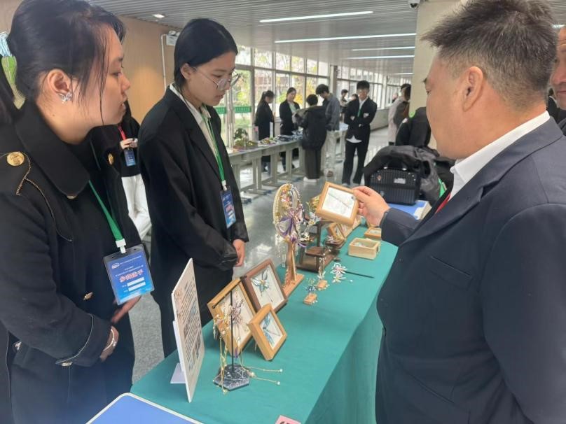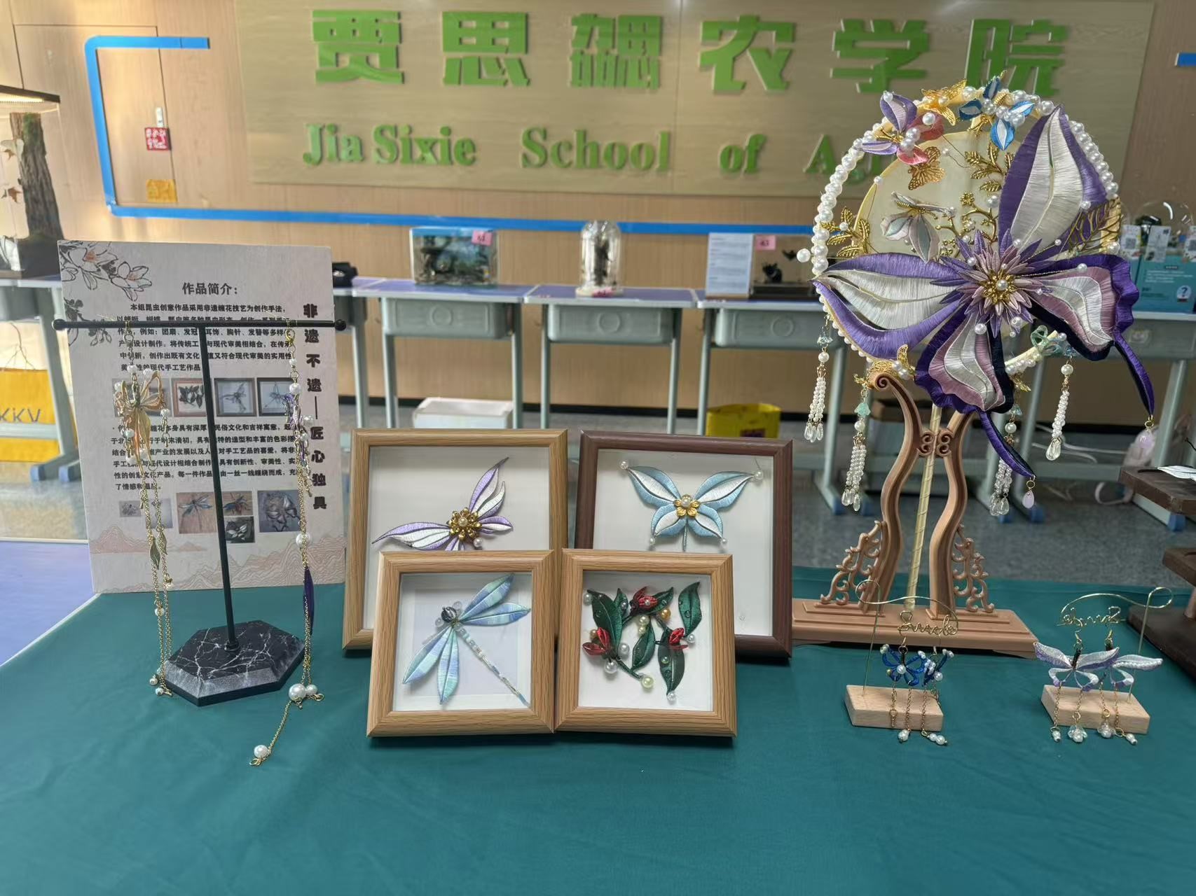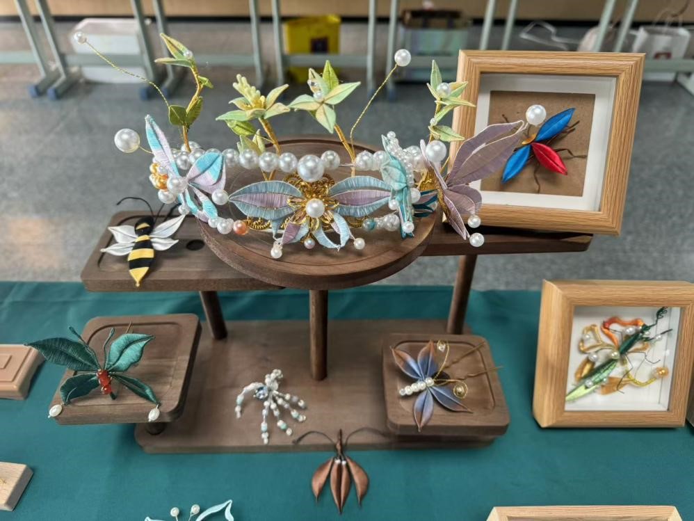参赛学生为我院23艺术设计班徐常琳、23视觉传达设计班刘星月、李亚坤三名学生,作品以非遗技法缠花为主要创作手法,结合多种昆虫形态创作一系列既有文化价值又符合现代审美的实用性、美观性的现代手工艺作品。