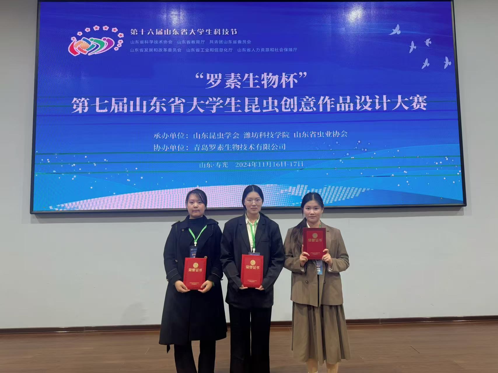 11.17日,由山东省科学技术协会、山东省教育厅、共青团山东省委等部门联合举办第十六届山东省大学生科技节——“罗素生物杯”第七届大学生昆虫创意作品设计大赛在潍坊科技学院顺利举办,经过激烈角逐,由我院王维娜老师指导的参赛队伍在决赛中喜获二等奖。