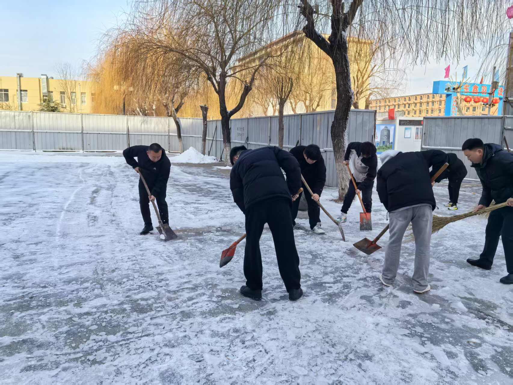 3月2日,一场冰雪不期而至,为学校披上了一层银装,也为师生出行带来诸多不便。为保障师生的出行安全,在教育与艺术学院党总支书记郑联先、学生管理科科长赵鲁强的带领下,辅导员、教师和学院先锋志愿者,迅速启动“破冰行动”,对教学楼周边积雪进行集中清理。后勤保障部王部长也积极协调后勤工作人员前来助力,大家见雪上岗、以动制“冻”,回到校园,迅速进入“除雪保障”状态,留下一抹抹浴“雪”奋战的身影。