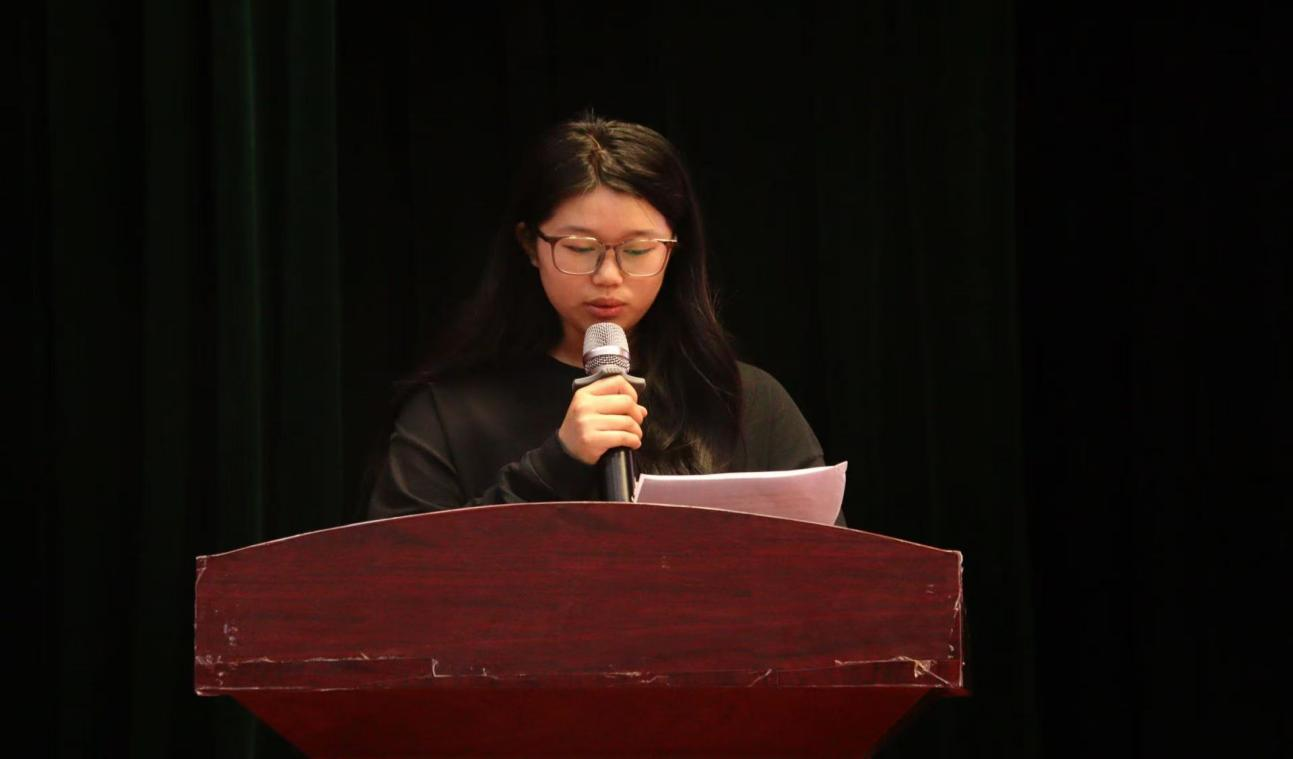随后,学生代表吴孜怡上台发言。她结合樊德祥的事迹,坦诚地反思了自己在服务同学时遇到的困难与不足。她深刻认识到,与樊德祥几十年如一日的坚守相比,自己的努力远远不够。她提出了具体的未来改进计划,包括更加积极主动地倾听同学们的需求、创新服务方式方法等。同时,她还呼吁全体学生干部以樊德祥为榜样,积极行动起来,用实际行动践行责任与担当。