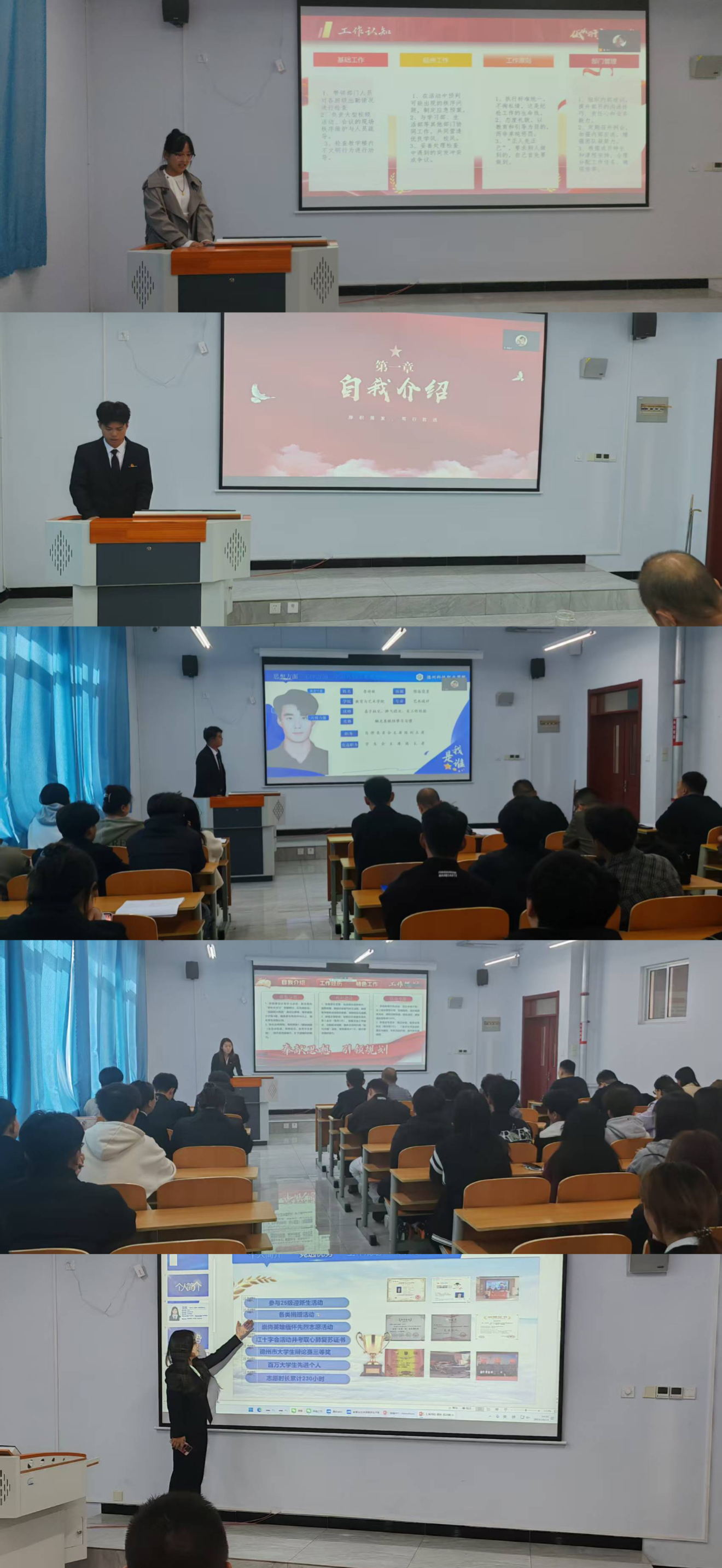 PPT评选现场,学院党总支书记冉祥勇、学生管理科负责人及专职辅导员老师组成评委团,全程参与评审工作。候选人结合PPT从自我介绍、工作契合度、工作成果、未来规划等方面展开汇报,岗位候选人重点聚焦“部门工作改进方向”深入阐述。评委团围绕“内容逻辑性、表达清晰度、岗位适配度、创新意识”四个维度综合评定,同时通过问答互动考察候选人应变能力,最终共同确定新一届学生干部及成员名单,并现场明确职责分工,强调工作纪律与责任担当。