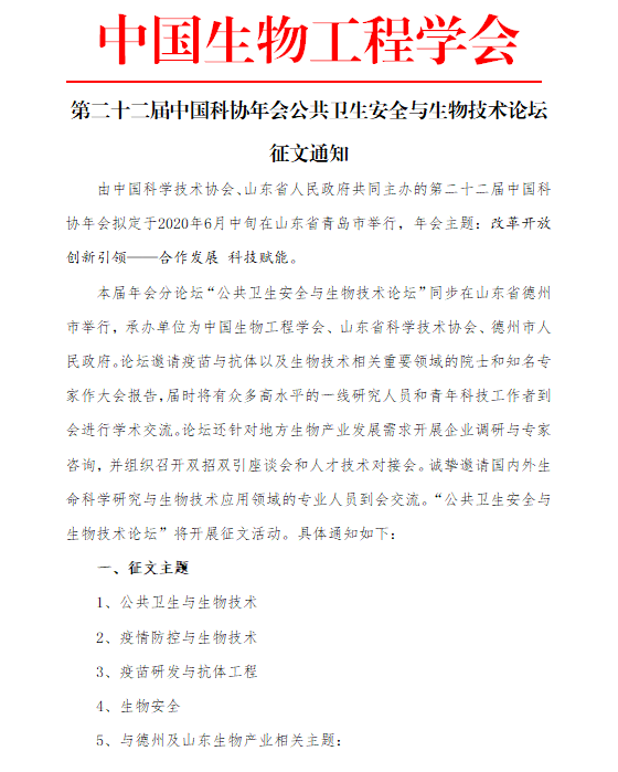 第22届中国科协年会公卫安全与生物技术论坛征文通知