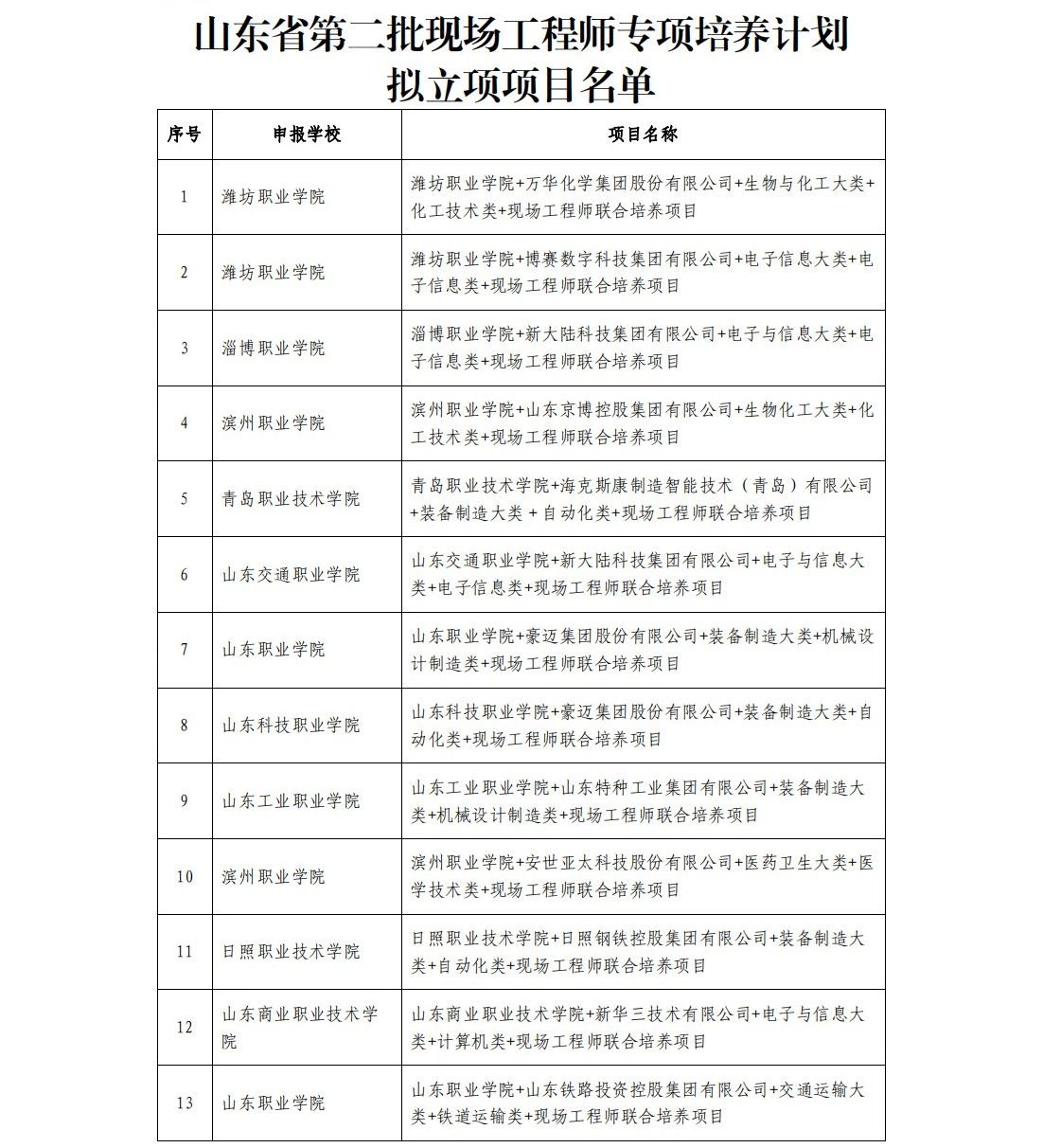 栏目推荐 教学科研 山东省第二批现场工程师专项培养计划项目遴选结果 根据《山东省教育厅关于开展山东省第二批现场工程师专项培养计划项目申报工作的通知》(鲁教职函〔2023〕61号)要求,经相关学校申报,我厅组织专家遴选,拟确定立项68个项目作为“山东省第二批现场工程师专项培养计划项目”。德州科技职业学院的新华三技术有限公司+电子与信息大类+计算机类+现场工程师联合培养项目通过遴选。 上一篇:德州科技职业学院获大数据产教融合分中心授牌 下一篇:“智驭未来·码动梦想” ——信息工程学院举办计算机程序员职业认定培训会