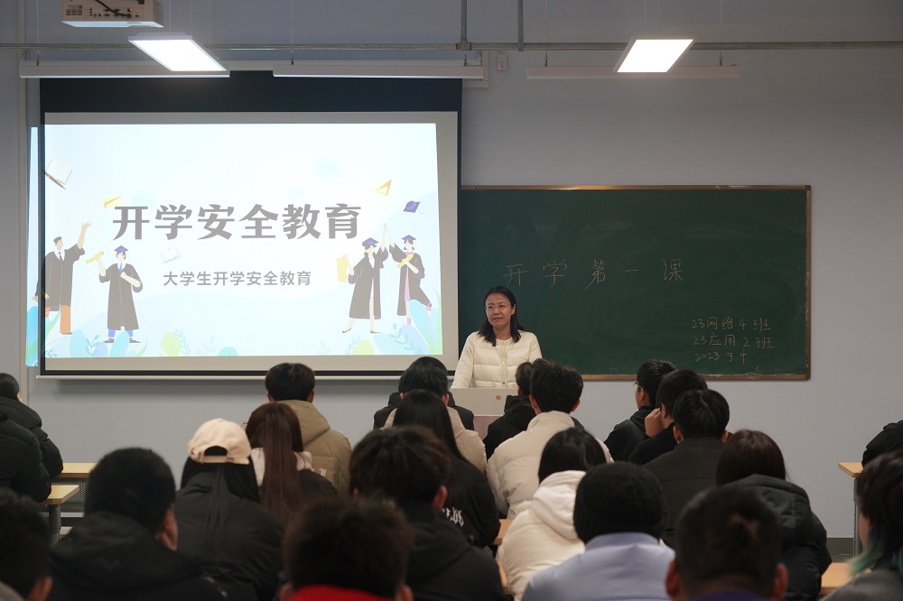 2024年3月4日信息工程系全体教师会议结束后,迅速制作《开学安全第一课》统一课件模板,利用晚自习时间,系主任邵淑华及各辅导员落实开学安全第一课活动。