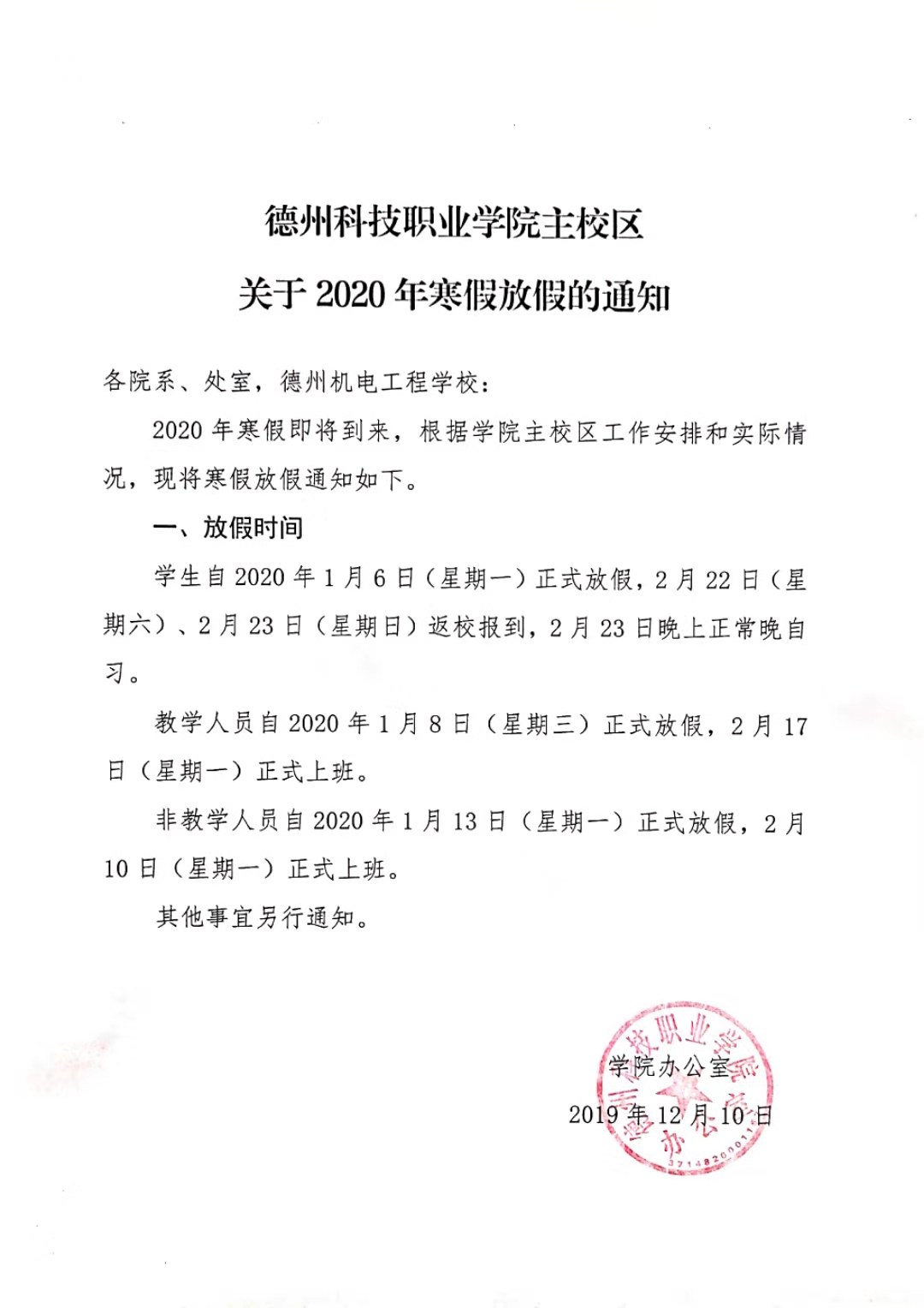 关于2020年寒假放假通知