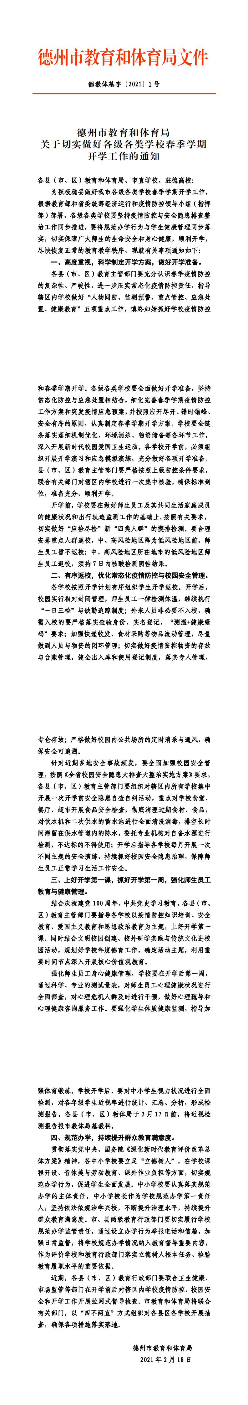 德州市教育和体育局关于做好春季学期开学工作的通知