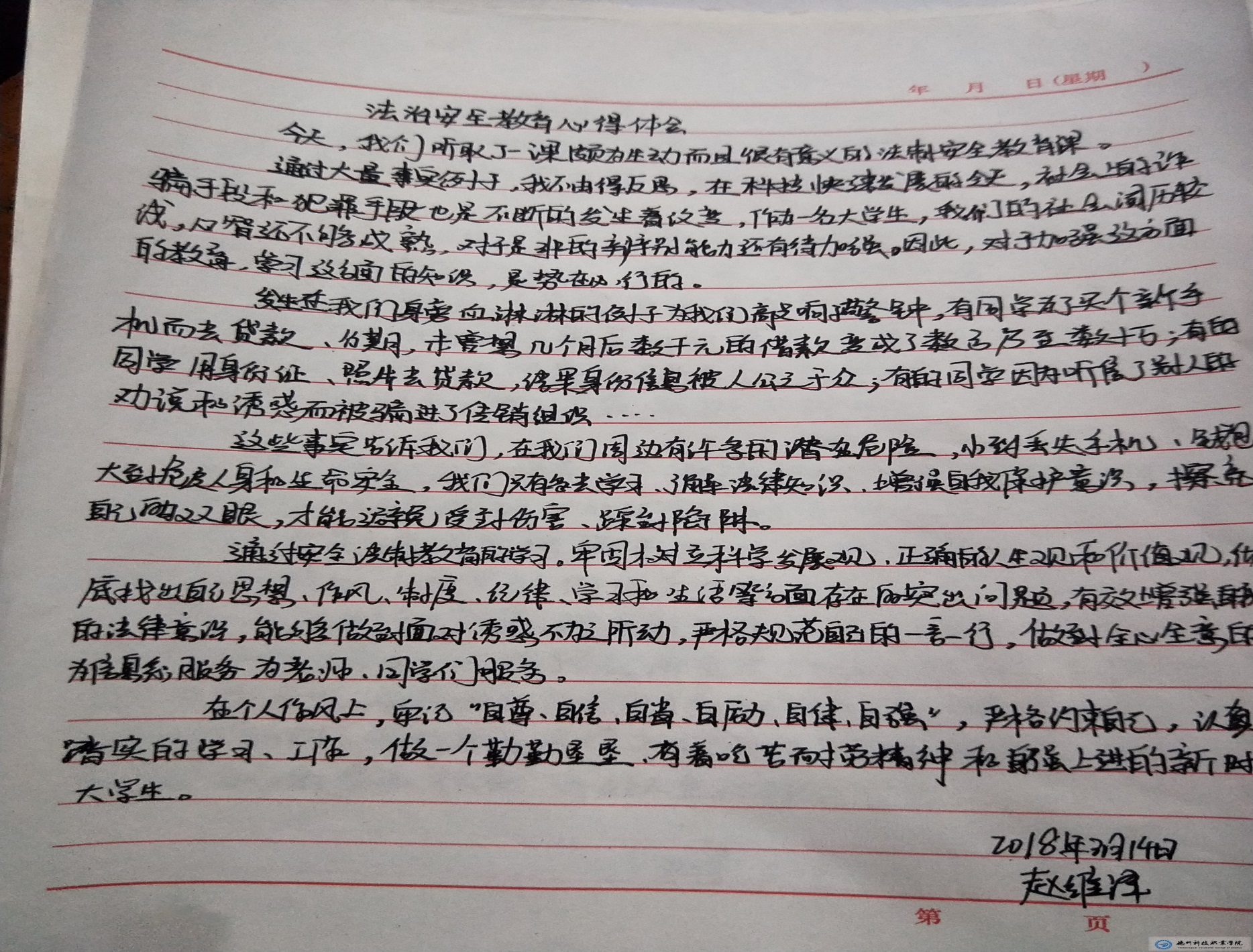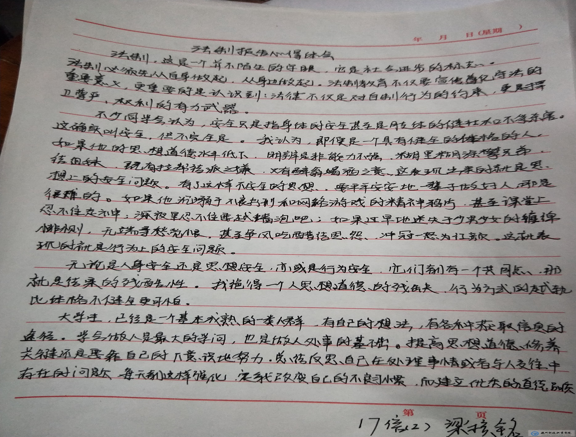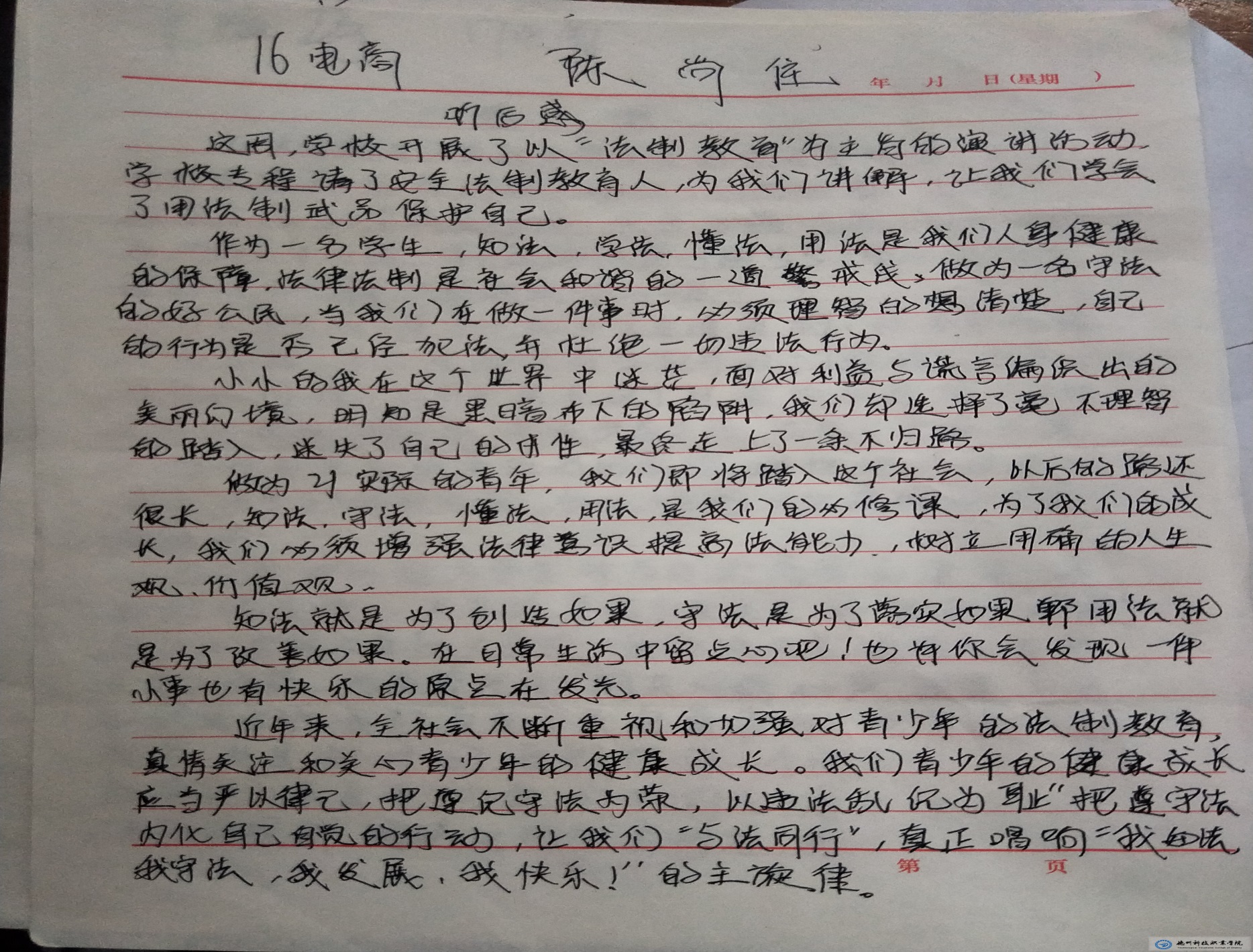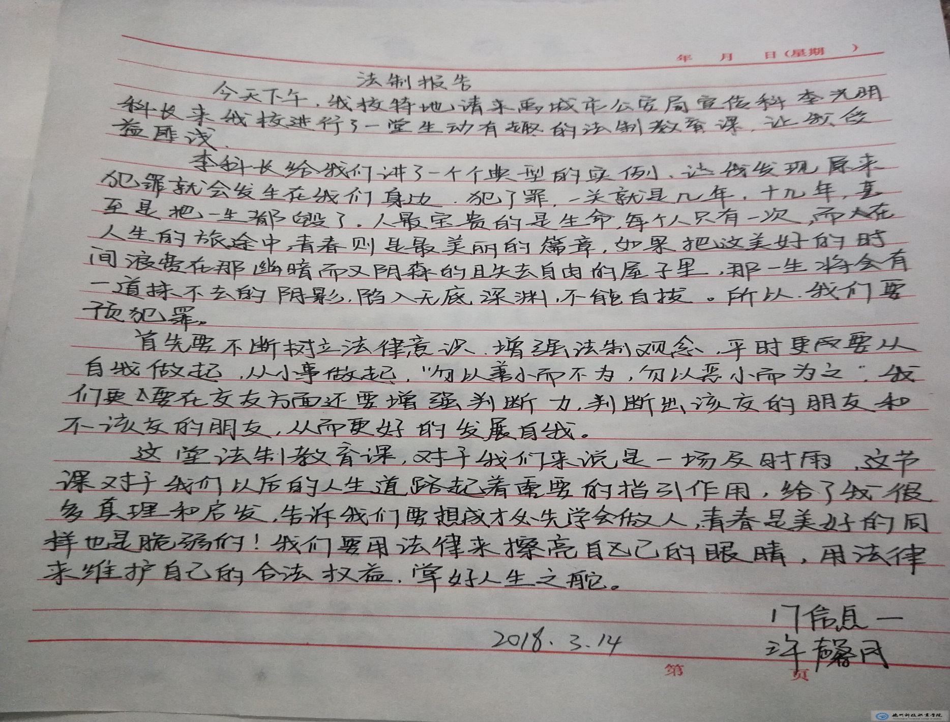 会后,为了进一步加深学生对本次法制报告会的认识,系部徐有华老师指导全系学生完成了法制报告会的心得体会。以下是我系各班对本次法制报告会的总结: