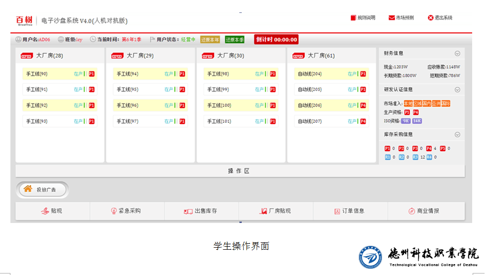 培训会上,邵主任指出杭州百树科技有限公司研发的ERP沙盘模拟课程体系,尤其是电子沙盘(人机对抗版)可全真模拟企业经营过程,可充分感受市场竞争氛围,集成进行选单、多市场同选、竞单、组间交易等多种活动。邵主任语言精练,深入浅出,运用现场模拟、实例剖析等交互式教学方法,指导全体师生运用人机对抗的方式进行自我训练,学习相关规则、知识及流程,让大家真切地感受到公司经营的生产和销售过程的实际状况,提升了学生的学习兴趣,对未来学生了解市场,走进企业打下基础。