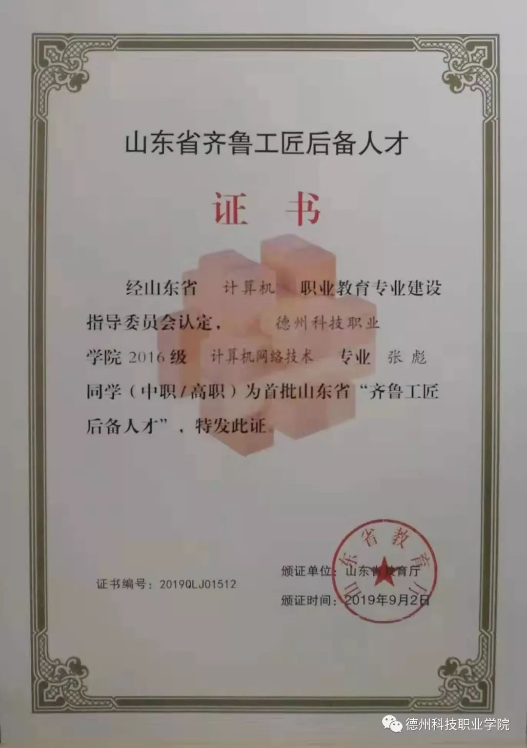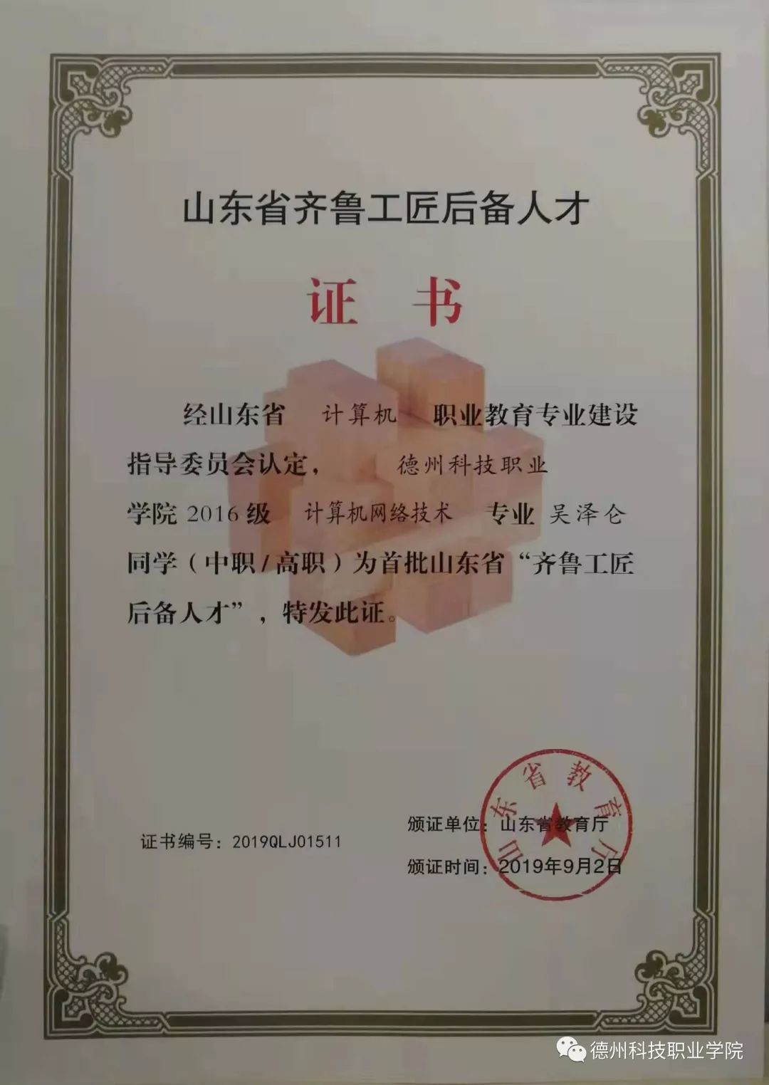 2016级华为班张彪,吴泽仑获得山东省教育厅颁发的首批“齐鲁工匠后备人才”证书,也是我院学生首次获此殊荣。