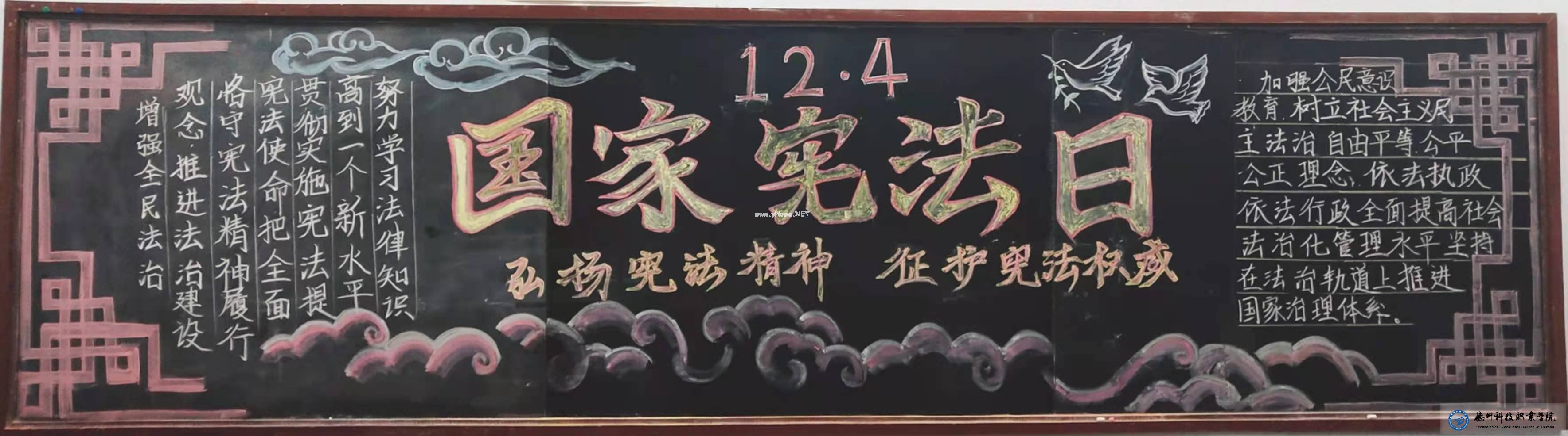 作为当代的大学生,在学校里我们不仅在学习知识,同时也在学习做人的道理和法律法规,以便更好的指导我们实践。每年的12月4日是国家宪法日。这次我校进行各班宪法宣传日黑板报的制作,学校以创建法治校园,形成良好的习惯,共同促进学校发展,力争让每一位老师、学生、家长安心,让社会放心为目的,展开这次宪法日的黑板报活动。