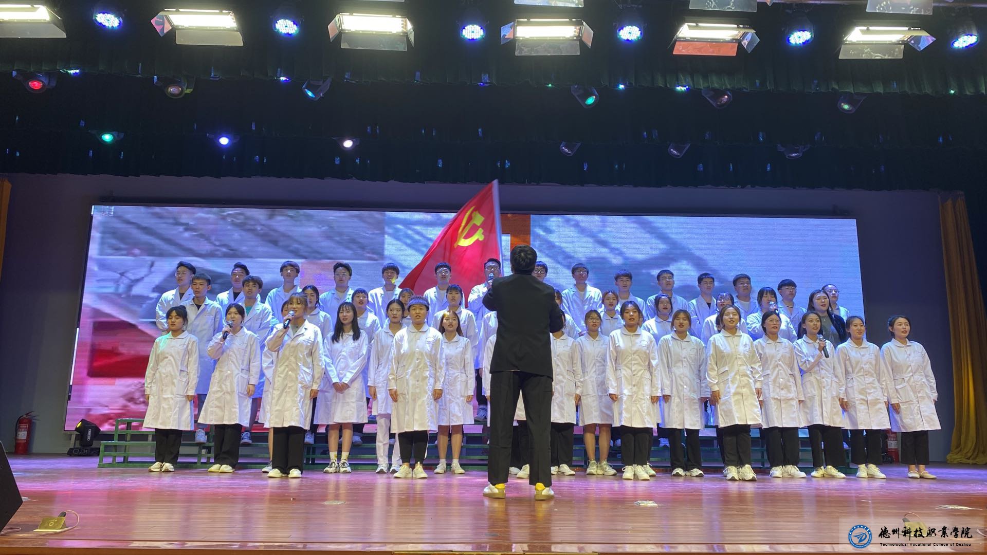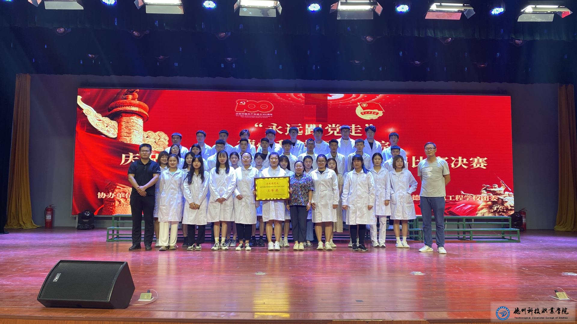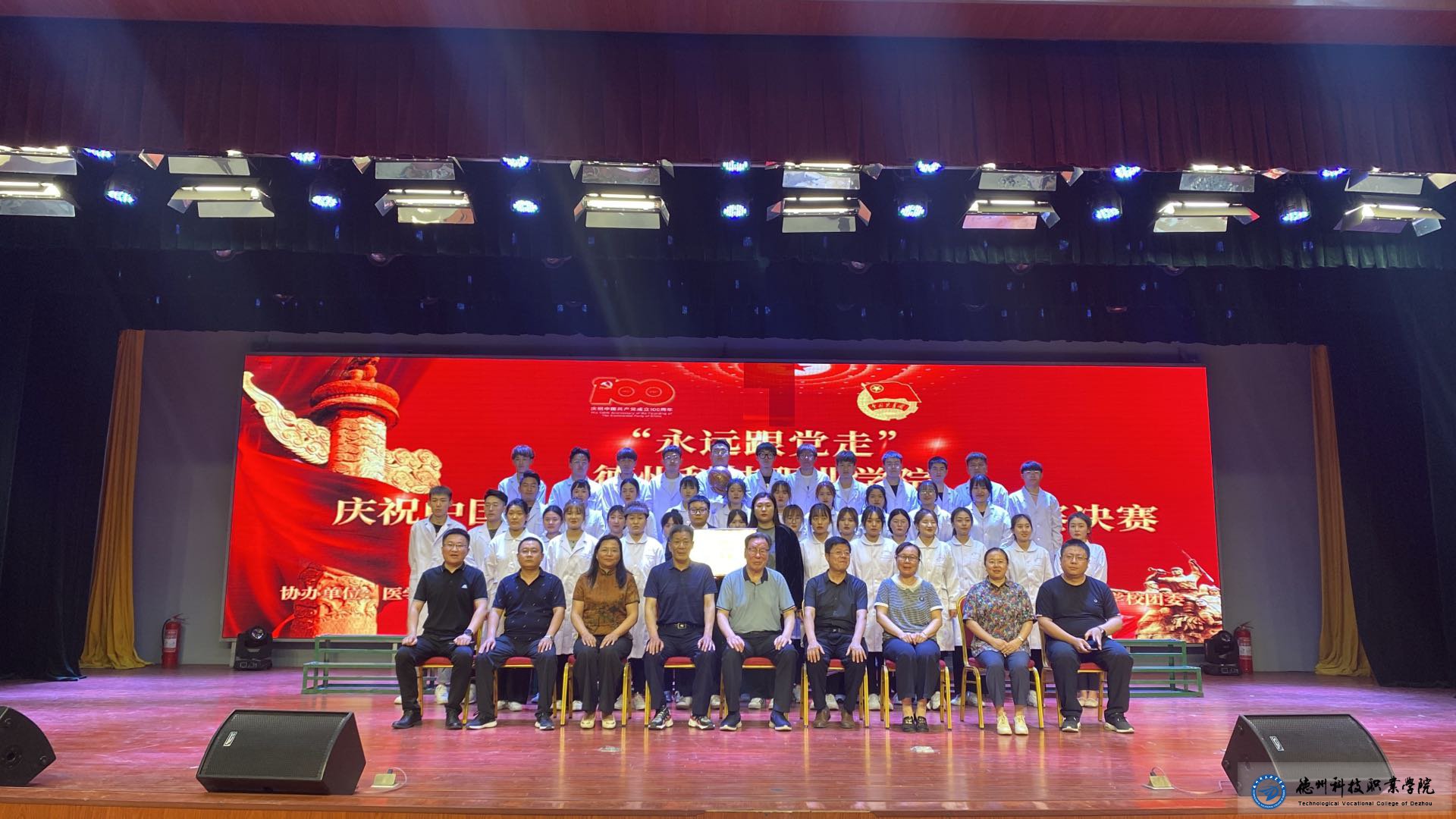 为进一步学党史、强信念、跟党走,2021年6月21日晚上医学护理学院的同学在大礼堂参加了德州科技职业学院庆祝中国共产党成立100周年合唱比赛,参加此次比赛有学校各领导,各系领导及各系的同学们。