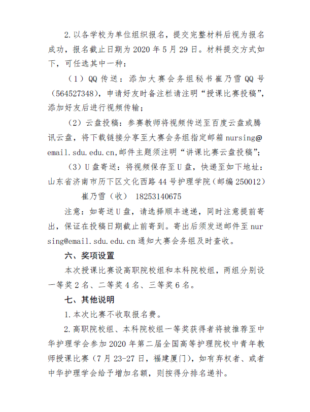 2.参赛人选应为具有教师资格证的护理学本科院校或高职院校的专任老师;符合以下条件的临床护理教师也可参赛;在院校附属医院工作、属于学院(系)教研室成员且承担护理学理论课教学、具有教师资格证。