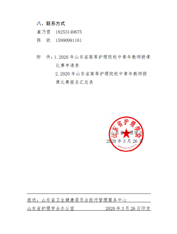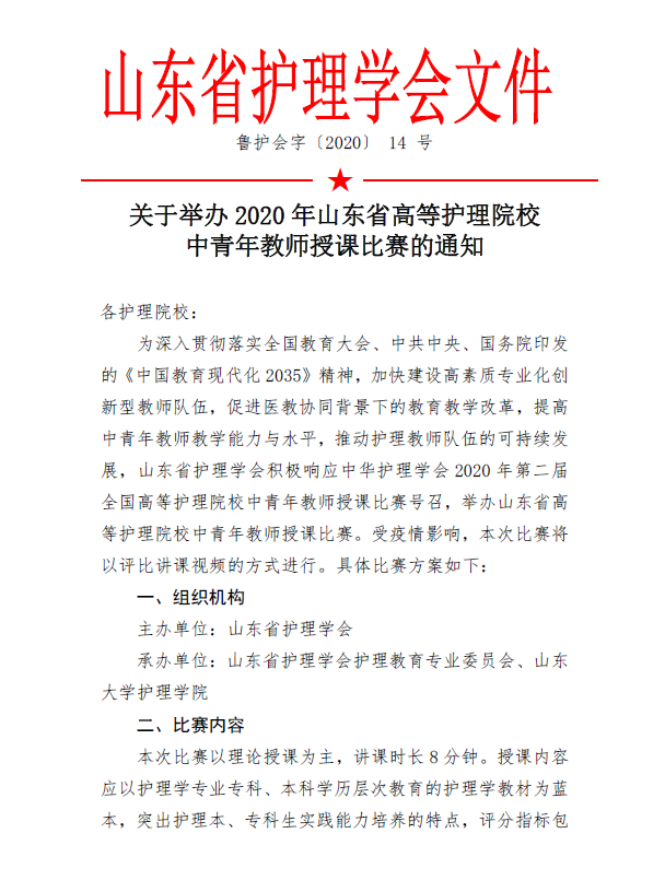 为加快建设高素质专业化创新型教师队伍,促进医教协同背景下的教育教学改革,提高中青年教师教学能力与水平,推动护理教师队伍的可持续发展,山东省护理学会积极响应中华护理学会2020 年第二届全国高等护理院校中青年教师授课比赛号召,举办山东省高等护理院校中青年教师授课比赛。