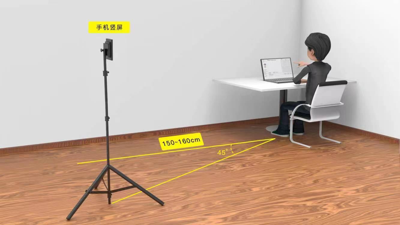 (2)手机摆放在侧后方45度,确保可以监控到电脑桌面、考生周围环境、监控考生考试的全过程。
